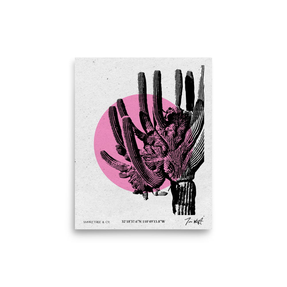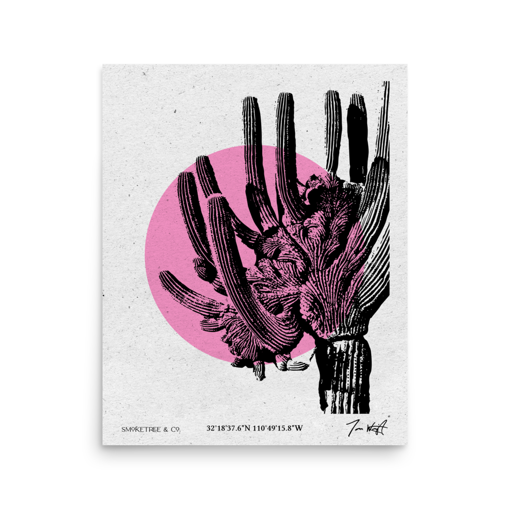 In the rugged heart of Sabino Canyon, just north of Tucson, stands one of the desert’s rarest wonders: the Crested Saguaro. This piece captures that singular, fan-shaped "crown" reimagined through a lens of contemporary design. Featuring a stylized pink sun that glows from behind and seemingly through the cactus, this work distills the vibrant, early-morning warmth of the Sonoran Desert into a bold, Mid-Century Modern form.